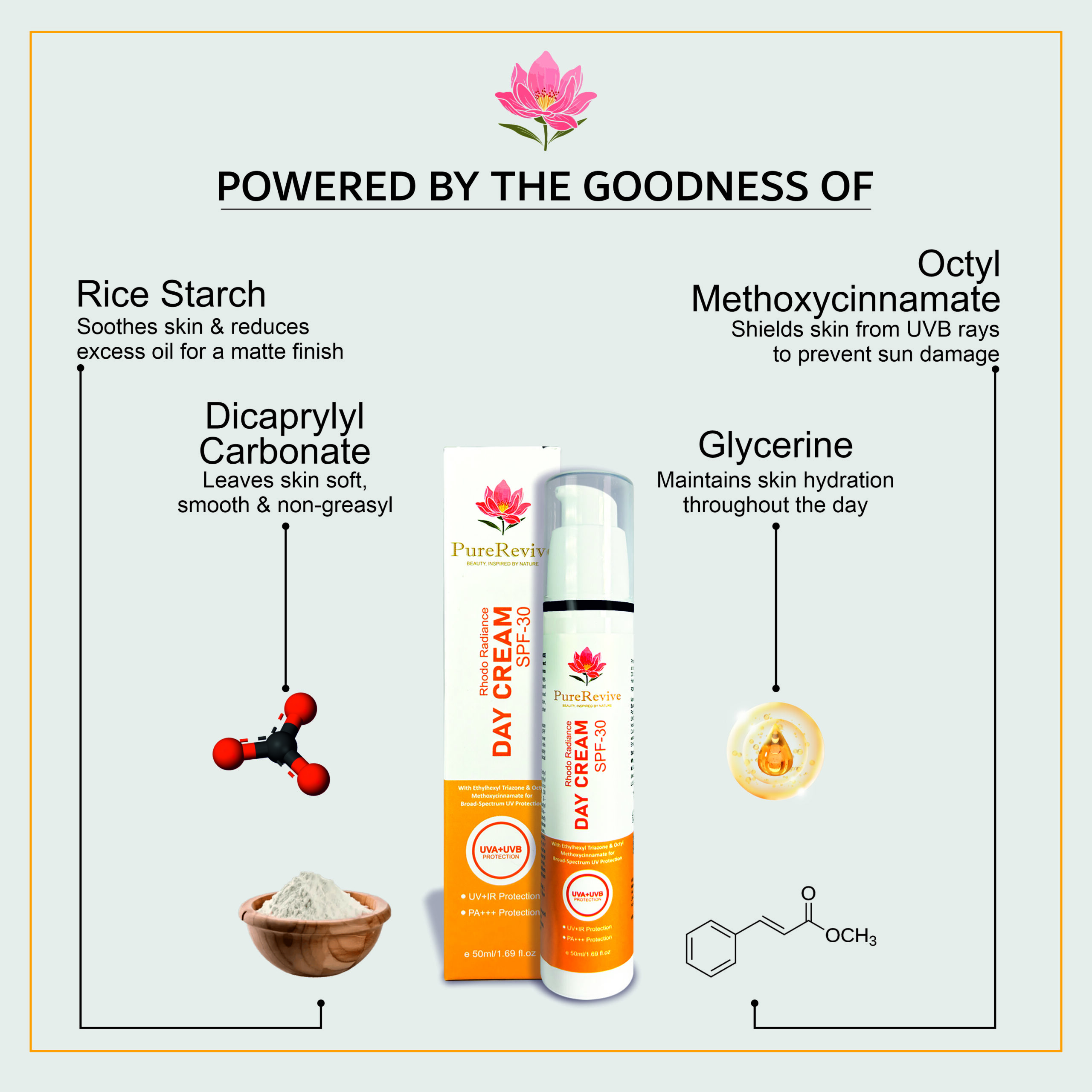 Skin Rejuvenation: Some studies suggest that extracts from the Rhododendron genus can improve skin hydration and elasticity, contributing to a more youthful and glowing appearance. Anti-inflammatory Properties: Buransh possesses natural anti-inflammatory properties. This can help soothe irritated skin and potentially reduce redness, contributing to a more even skin tone. Protection Against Environmental Stressors: The antioxidants present in Buransh can help protect the skin against damage caused by environmental pollutants and UV rays (in addition to the SPF 30). In summary: incorporating Buransh into a Radiance Day Cream with SPF 30 could offer a multi-pronged approach to achieving radiant and healthy skin by providing antioxidant protection, anti-inflammatory benefits, potential hydration, and support for collagen production, all while shielding the skin from UV damage. |